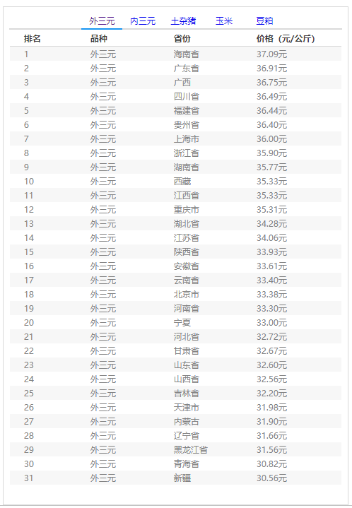 今日猪价最高地区为海南省37.09元/公斤,最低地区为新疆维吾尔自治区30.57元/公斤。