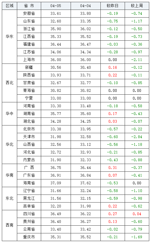 内三元生猪均价为32.99元/公斤,价格较昨日下跌0.56元/公斤;
