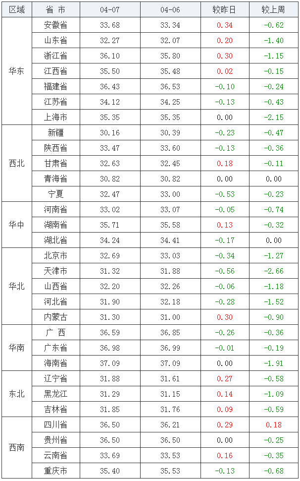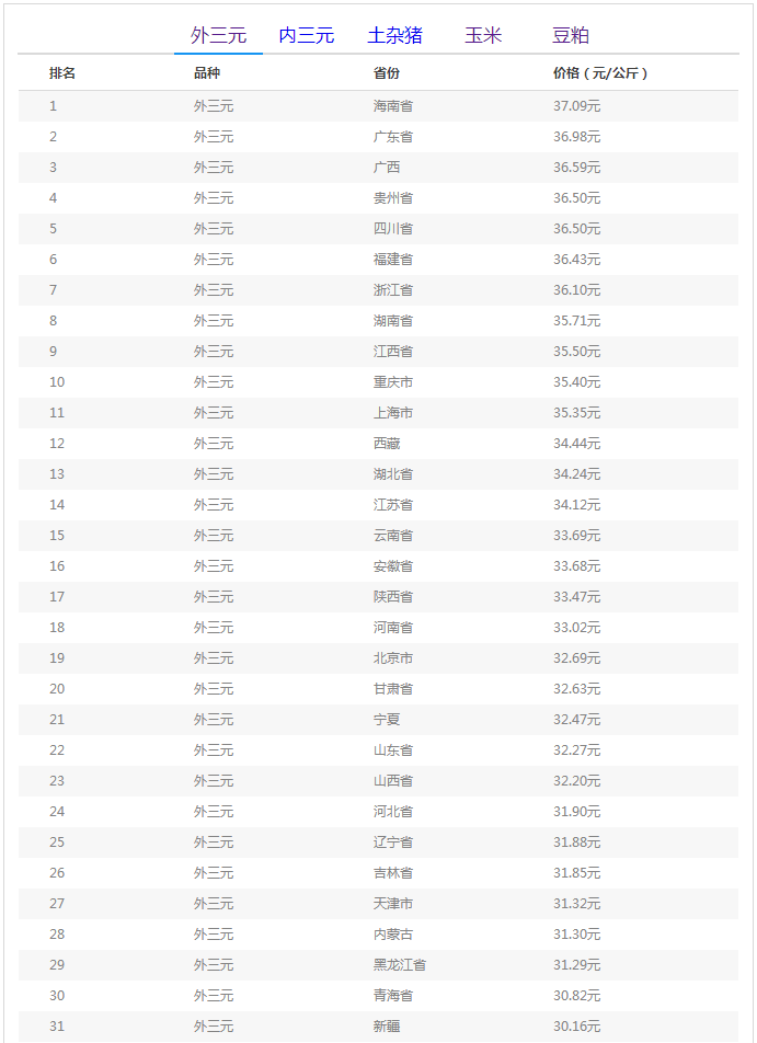 今日猪价最高地区为海南省37.09元/公斤,最低地区为新疆维吾尔自治区30.16元/公斤。