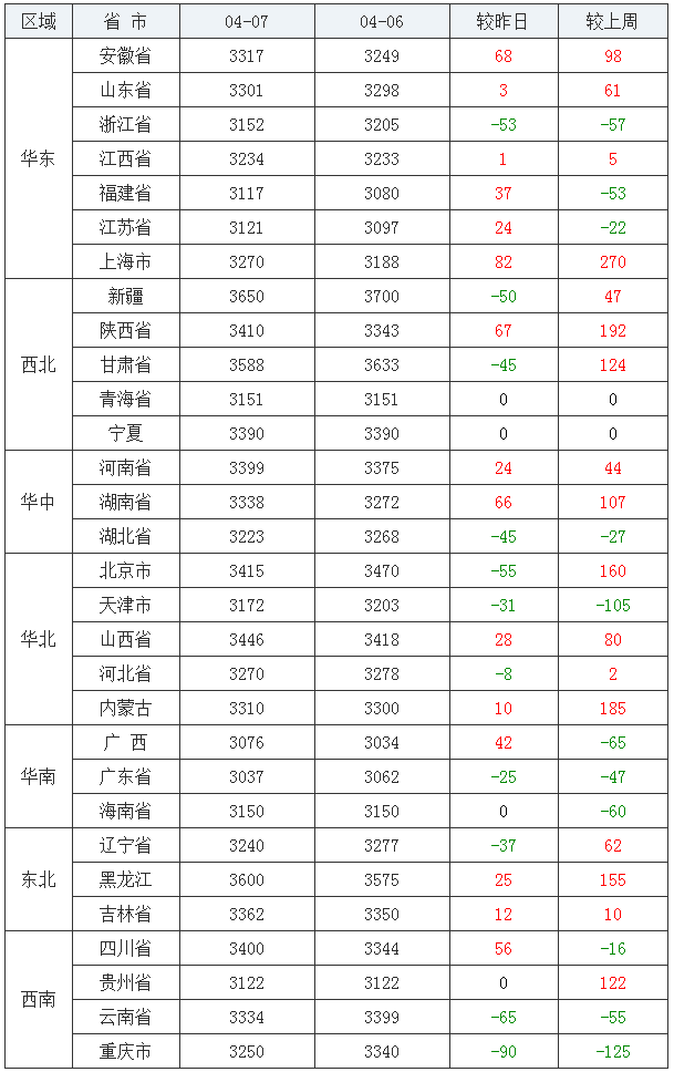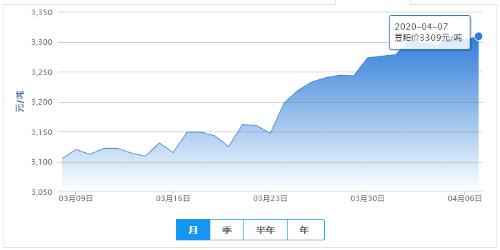 2020年04月07日,今日全国豆粕均价为3309元/吨,较昨日上涨6元/吨。