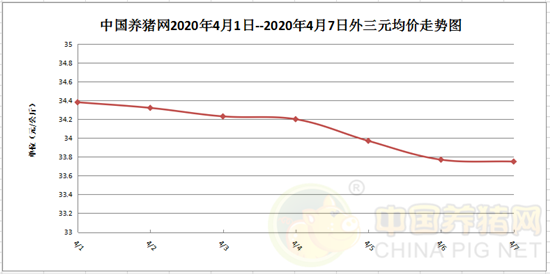 2020年4月7日,据中国养猪网猪价系统监测全国外三元均价为33.75元/公斤,价格较昨日下跌0.02元/公斤。上周全国外三元均价为34.38元/公斤,今日较上周下跌了0.63元/公斤。内三元均价为32.94元/公斤,较昨日下跌0.13元/公斤。土杂猪均价为32.26元/公斤,价格较昨日下跌0.11元/公斤。