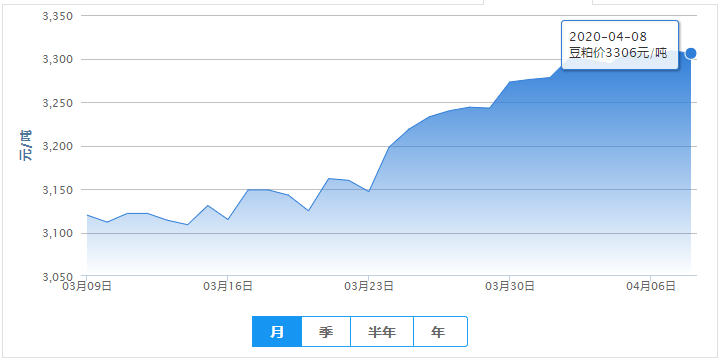 2020年04月08日,今日全国豆粕均价为3306元/吨,较昨日下跌3元/吨。