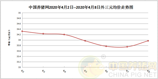 2020年4月8日,据中国养猪网猪价系统监测全国外三元均价为33.97元/公斤,价格较昨日上涨0.22元/公斤。上周全国外三元均价为34.32元/公斤,今日较上周下跌了0.35元/公斤。内三元均价为33.20元/公斤,较昨日上涨0.26元/公斤。土杂猪均价为32.53元/公斤,价格较昨日上涨0.27元/公斤。