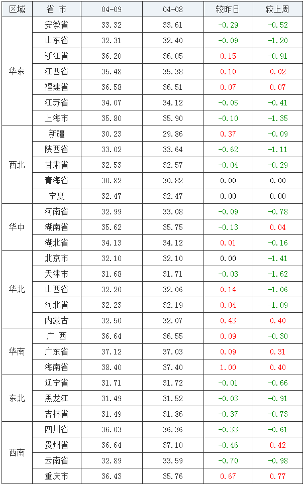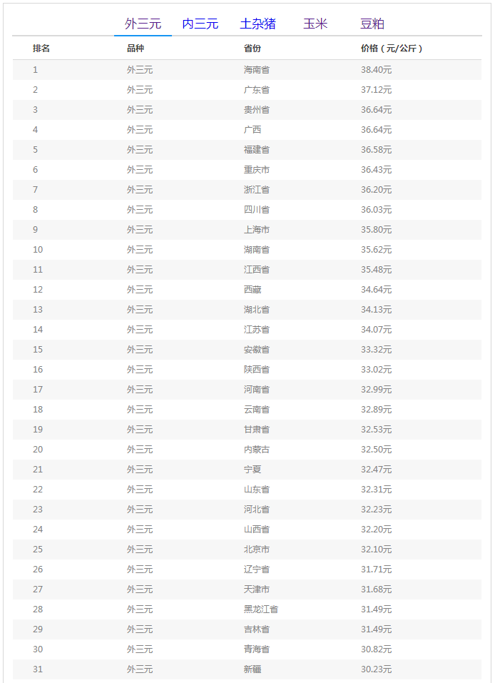 今日猪价最高地区为海南省38.40元/公斤,最低地区为新疆维吾尔自治区30.23元/公斤。