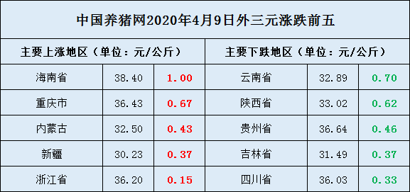 猪价排名前三的地区有:海南省、广东省、贵州省。