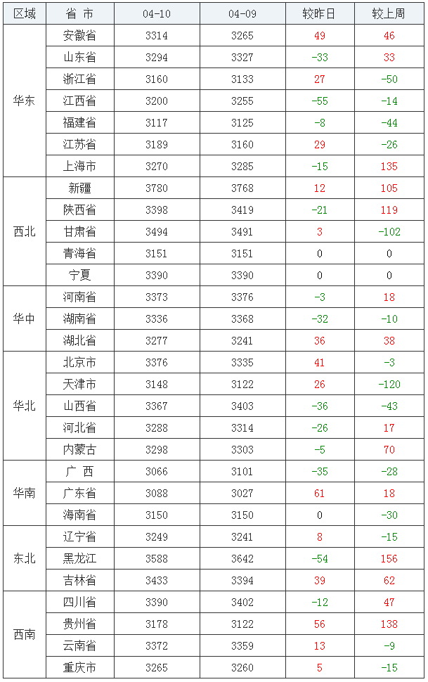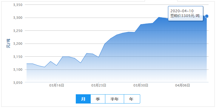 2020年04月10日,今日全国豆粕均价为3305元/吨,较昨日下跌3元/吨。