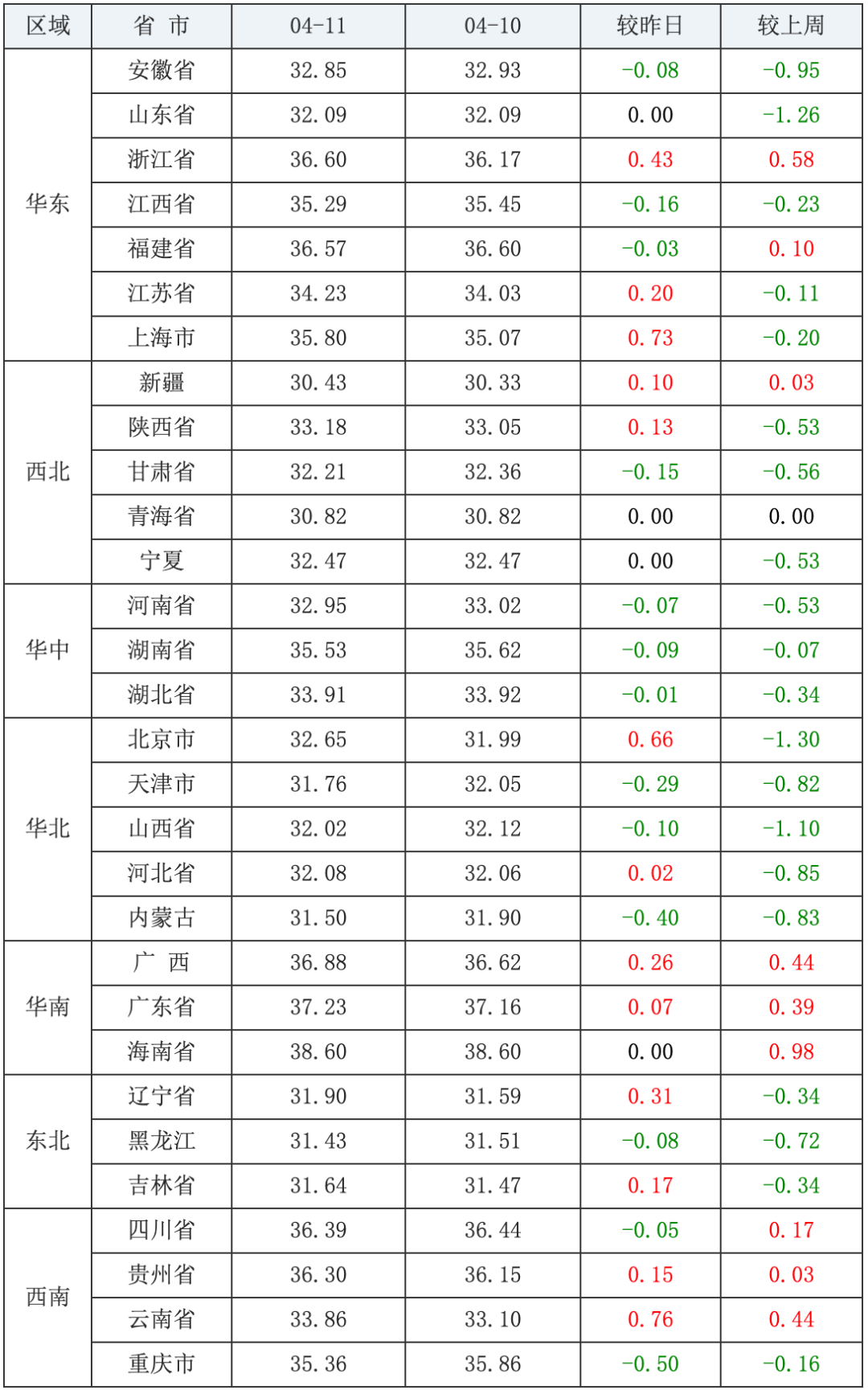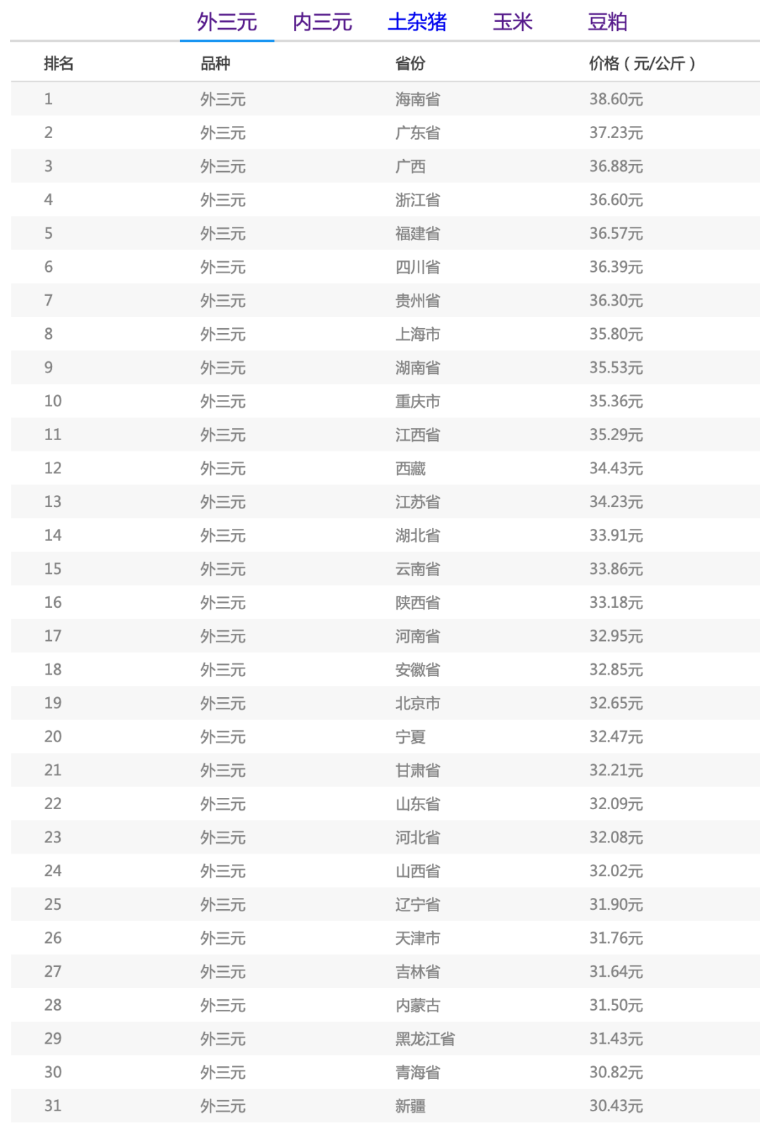 今日猪价最高地区为海南省38.60元/公斤,最低地区为新疆维吾尔自治区30.43元/公斤。