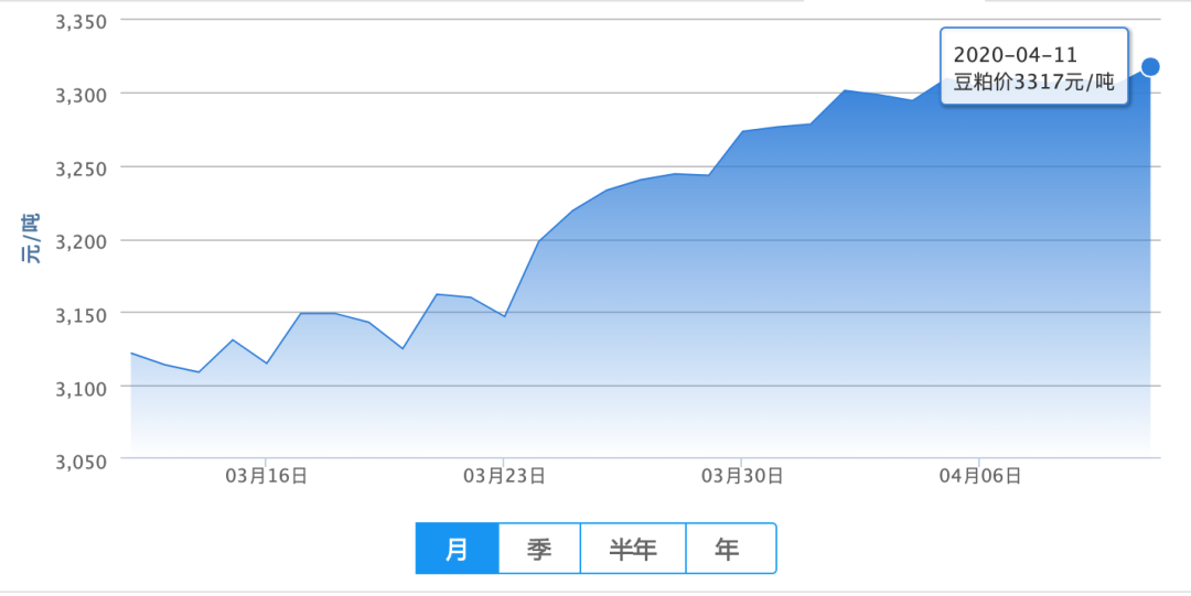 2020年04月11日,今日全国豆粕均价为3317元/吨,较昨日上涨12元/吨。