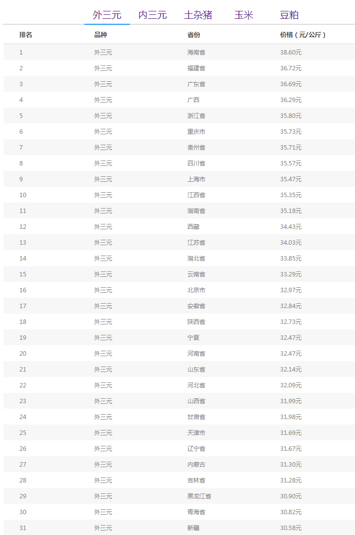 今日猪价最高地区为海南省38.60元/公斤,最低地区为新疆维吾尔自治区30.58元/公斤。