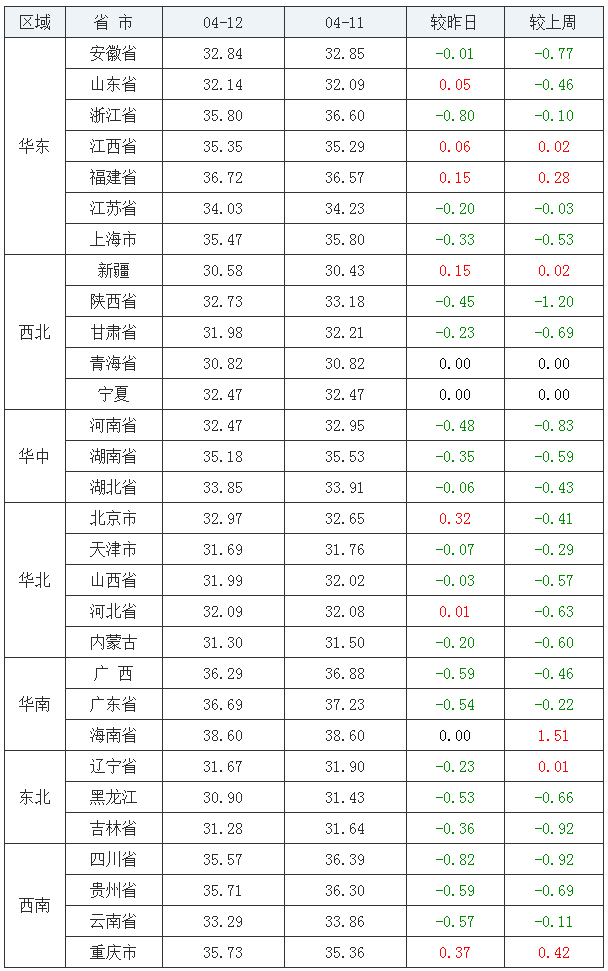 今日我国猪价上涨最大的省份是重庆市,价格较昨日上涨0.37元/公斤,下跌最大的省份是四川省,价格较昨日下跌0.82元/公斤。就今日生猪价格涨跌前五来看,重庆摆脱了昨日的下跌趋势转而上涨;下跌地区势头盖过上涨地区幅度。