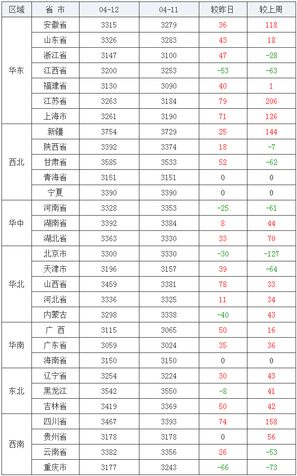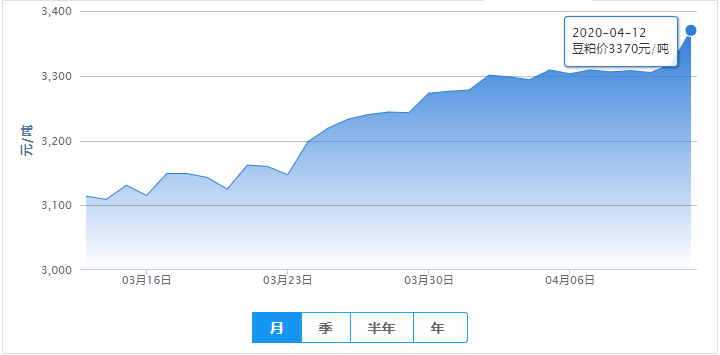 2020年04月12日,今日全国豆粕均价为3370元/吨,较昨日上涨53元/吨。