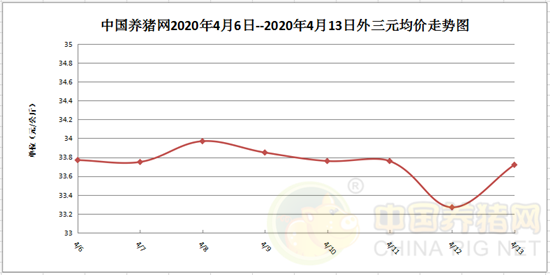 2020年4月13日,据中国养猪网猪价系统监测全国外三元均价为33.72元/公斤,价格较昨日上涨0.45元/公斤。上周全国外三元均价为33.77元/公斤,今日较上周下跌了0.05元/公斤。内三元均价为32.86元/公斤,较昨日上涨0.03元/公斤。土杂猪均价为32.27元/公斤,价格较昨日上涨0.01元/公斤。