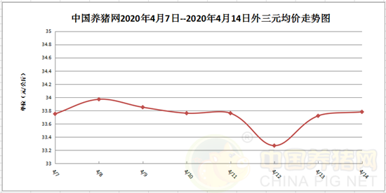 2020年4月14日,据中国养猪网猪价系统监测全国外三元均价为33.78元/公斤,价格较昨日上涨0.06元/公斤。上周全国外三元均价为33.75元/公斤,今日较上周下上涨0.03元/公斤。内三元均价为32.72元/公斤,较昨日下跌0.14元/公斤。土杂猪均价为32.21元/公斤,价格较昨日下跌0.06元/公斤。