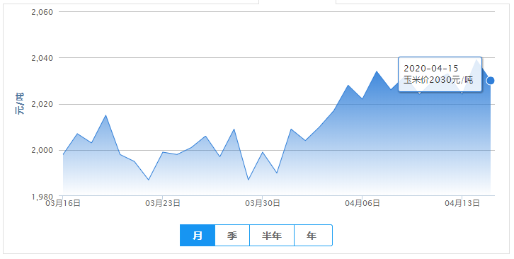 2020年04月15日,今日全国玉米均价为2030元/吨,较昨日下跌9元/吨。
