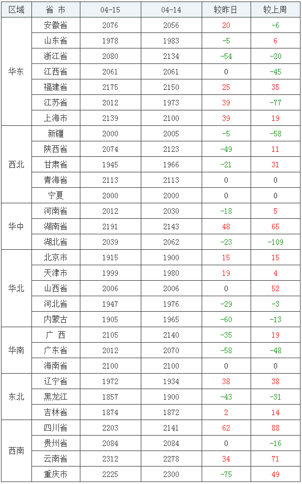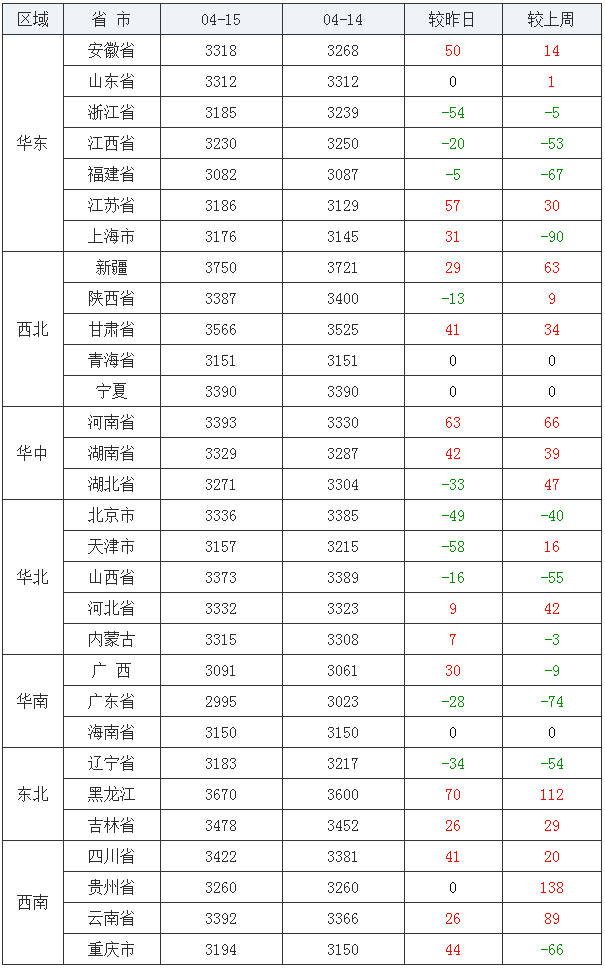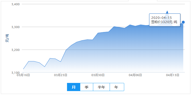 2020年04月15日,今日全国豆粕均价为3320元/吨,较昨日上涨14元/吨。
