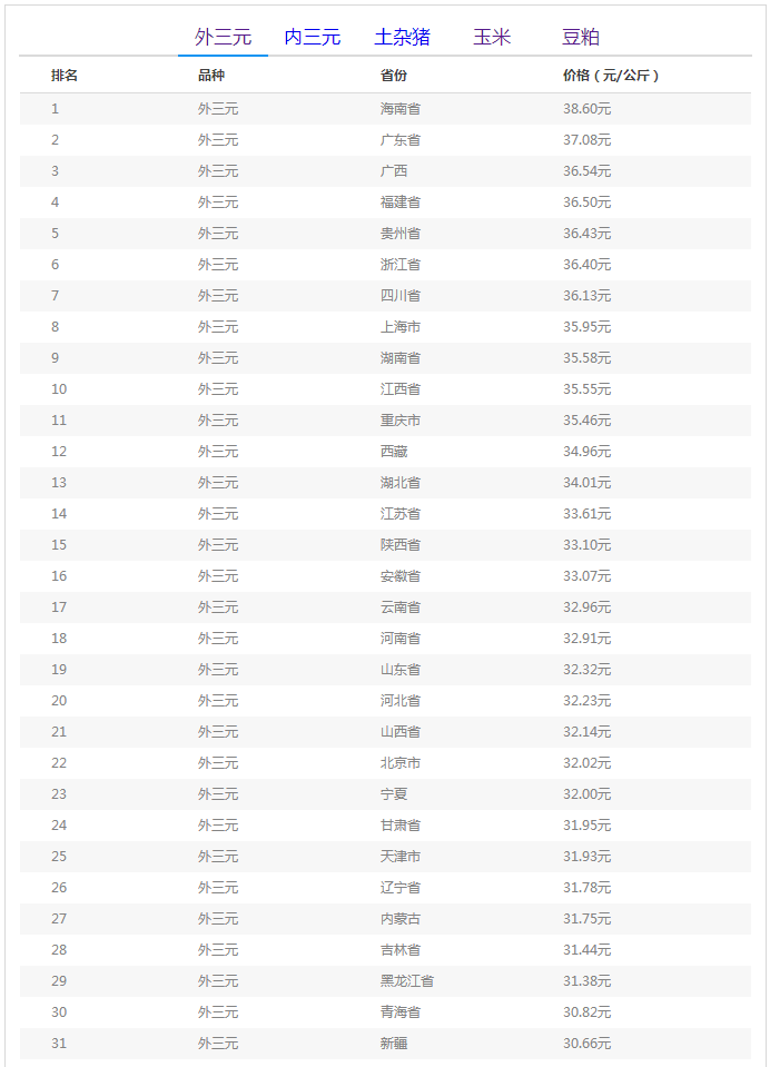 今日猪价最高地区为海南省38.60元/公斤,最低地区为新疆维吾尔自治区30.66元/公斤。
