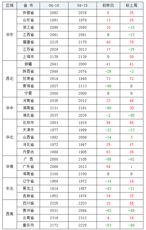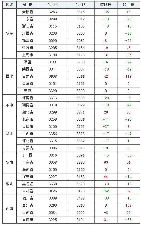 豆粕均价(43%蛋白)前五:新疆维吾尔自治区3744元/吨、黑龙江省3630元/吨、甘肃省3608元/吨、吉林省3426元/吨、宁夏回族自治区3390元/吨;