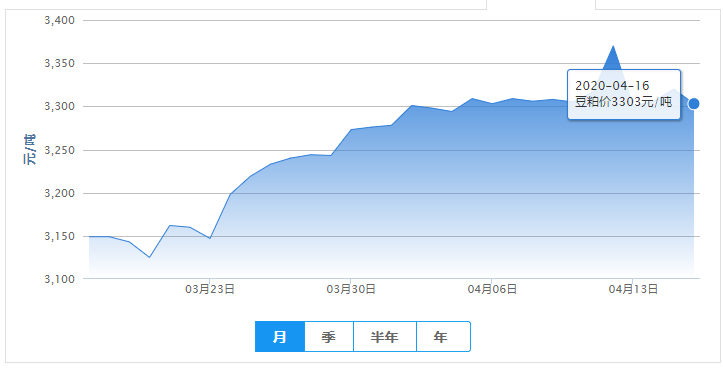 2020年04月16日,今日全国豆粕均价为3303元/吨,较昨日下跌17元/吨。