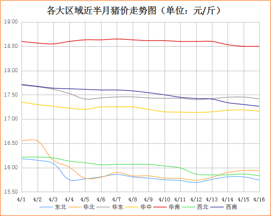 目前国内各大区域猪价差异化表现明显,华北、华中、西北地区猪价出现微幅反弹现象,华北、华南地区猪价出现稳定态势,东北、华东、华中、西北、西南地区猪价继续微幅下跌,整体猪价出现微幅下跌态势。