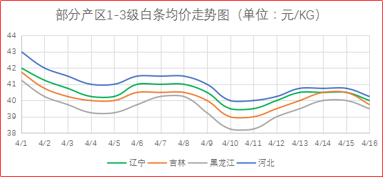 从辽宁、吉林、黑龙江、河北等产区1-3级白条主流批发价格来看,河北、辽宁、吉林、黑龙江地区白条价格呈现下跌态势,河北、辽宁、黑龙江地区白条价格下跌幅度在500元/吨,吉林地区白条价格下跌幅度在500-1000元/吨,贸易商采购性积极性表现一般。