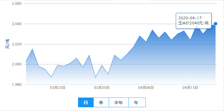 2020年04月17日,今日全国玉米均价为2040元/吨,较昨日上涨3元/吨。