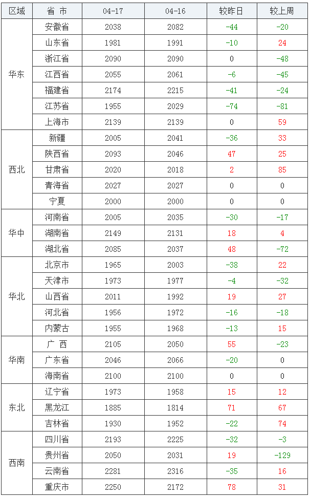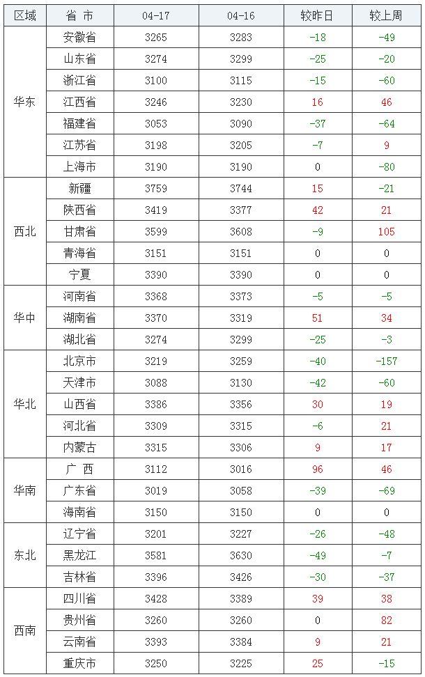 豆粕均价(43%蛋白)前五:新疆维吾尔自治区3759元/吨、甘肃省3599元/吨、黑龙江省3581元/吨、四川省3428元/吨、陕西省3419元/吨;