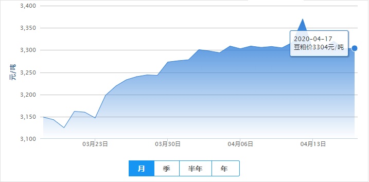 2020年04月17日,今日全国豆粕均价为3304元/吨,较昨日上涨1元/吨。