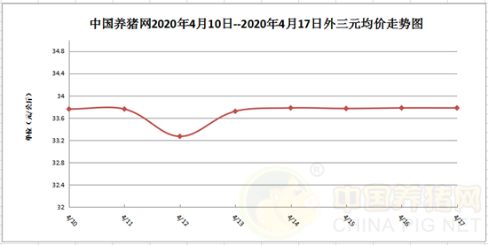 2020年4月17日(星期五),据中国养猪网猪价系统监测全国外三元均价为33.78元/公斤,价格较昨日持平,较上周下跌0.02元/公斤。目前生猪价格大体以稳定为主,下跌势头有增大趋势。