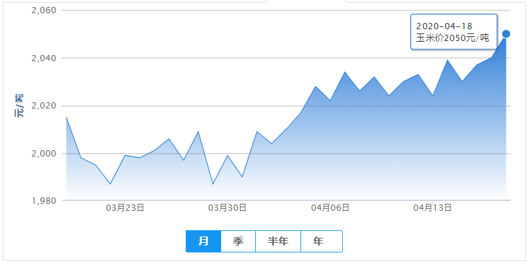 2020年04月18日,今日全国玉米均价为2050元/吨,较昨日上涨10元/吨。