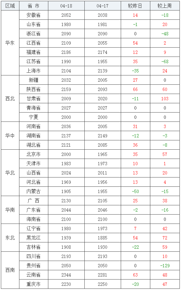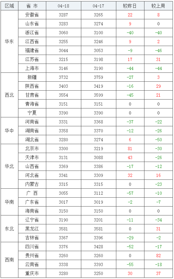 豆粕均价(43%蛋白)前五:新疆维吾尔自治区3732元/吨、黑龙江省3581元/吨、甘肃省3554元/吨、陕西省3403元/吨、宁夏回族自治区3390元/吨;