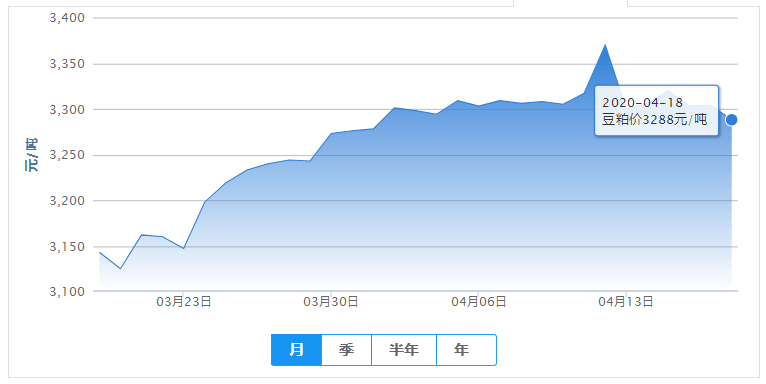 2020年04月18日,今日全国豆粕均价为3288元/吨,较昨日下跌16元/吨。