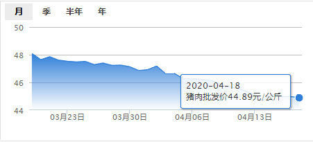 今日猪肉批发价为44.89元/公斤,价格较昨日持平,较上周(4月11日)下跌0.70元/公斤。由上图可见,猪肉价格整体走势持续走跌,近日价格有趋缓迹象。