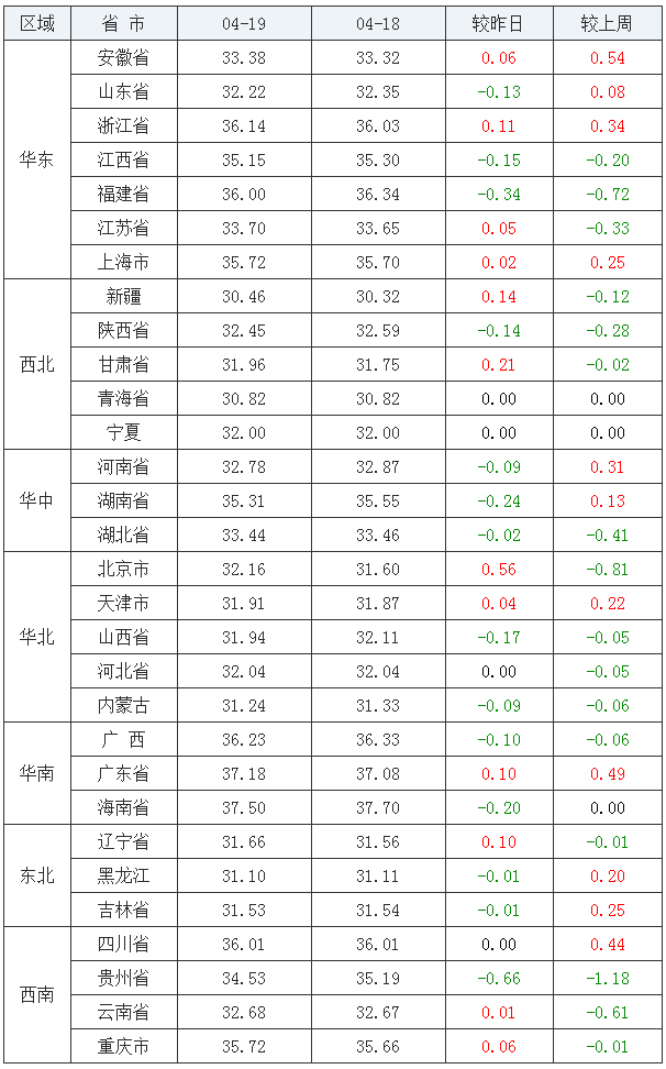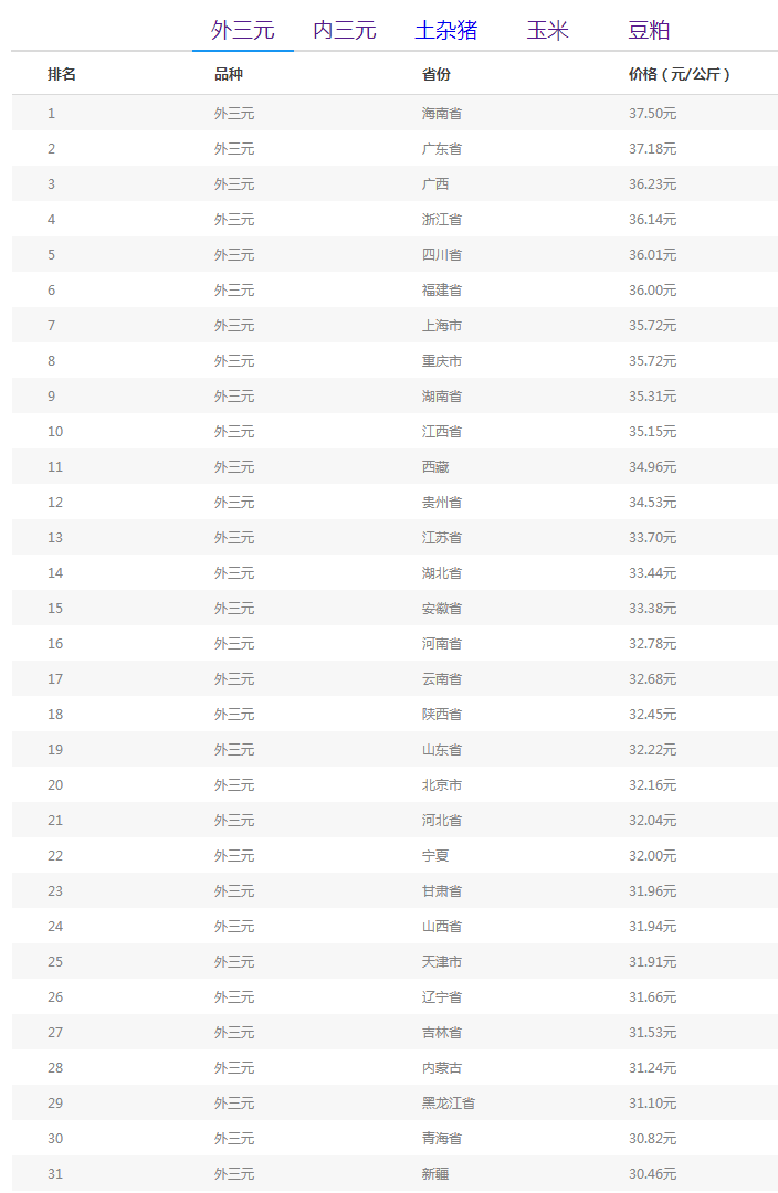 今日猪价最高地区为海南省37.50元/公斤,猪价最低地区为新疆维吾尔自治区30.46元/公斤。