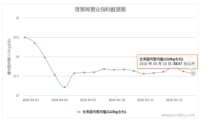 搜猪网监测数据显示:今日全国瘦肉型生猪出栏均价至33.57元/公斤,较昨日33.62元/公斤下降了0.05元/公斤,周末这两天大部分区域属小幅盘整持续之前涨跌互现之势.........
