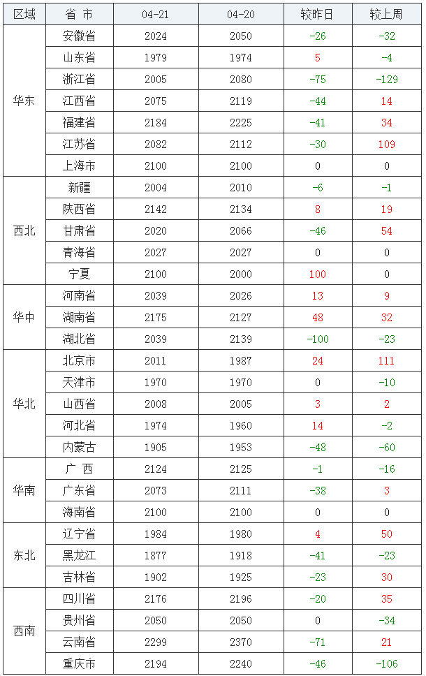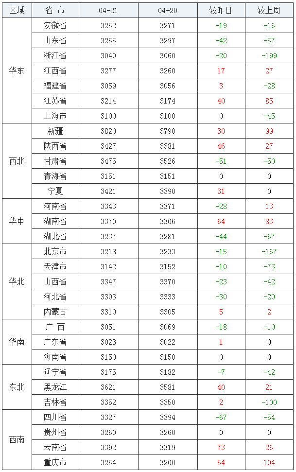 豆粕均价(43%蛋白)前五:新疆维吾尔自治区3820元/吨、黑龙江省3621元/吨、甘肃省3475元/吨、陕西省3427元/吨、宁夏回族自治区3421元/吨;