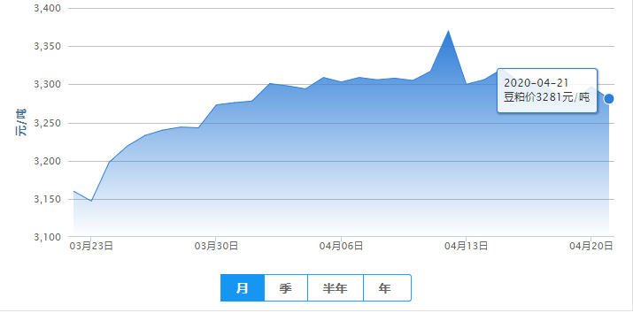 2020年04月21日,今日全国豆粕均价为3281元/吨,较昨日下跌16元/吨。