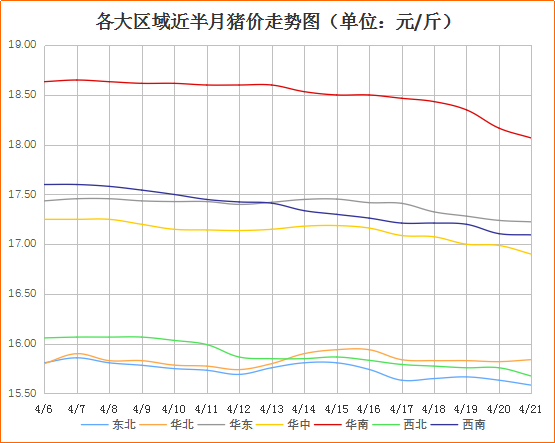 目前国内各大区域猪价差异化表现明显,东北、西南、华东、华中、华南、西北地区猪价均出现了一定幅度的下跌现象,西华北地区猪价呈现一定的上涨现象,整体猪价呈现继续微幅下跌走势。