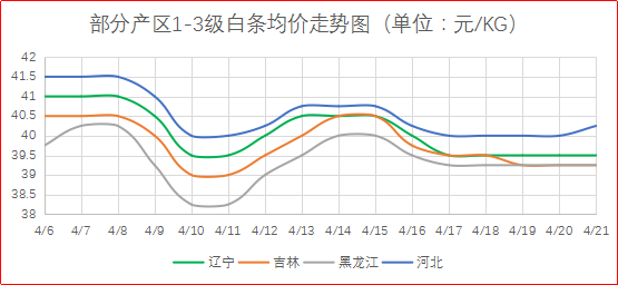 从辽宁、吉林、黑龙江、河北等产区1-3级白条主流批发价格来看,辽宁、吉林、黑龙江地区白条价格呈现稳定态势,河北地区白条价格有微幅反弹现象,贸易商采购性积极性表现一般。