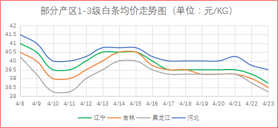 从辽宁、吉林、黑龙江、河北等产区1-3级白条主流批发价格来看,辽宁、吉林、黑龙江地区白条价格呈现下跌态势,下跌幅度在500-1000元/吨,贸易商采购性积极性表现一般。