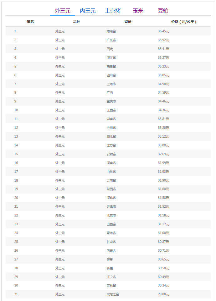 活猪价格排名前三的地区:海南省、广东省、西藏自治区。