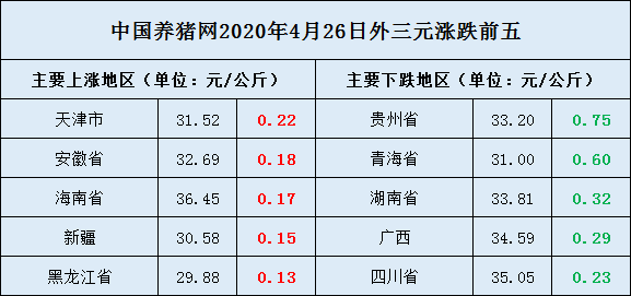 今日我国猪价上涨最多的地区:天津市,较昨日上涨了0.22元/公斤。