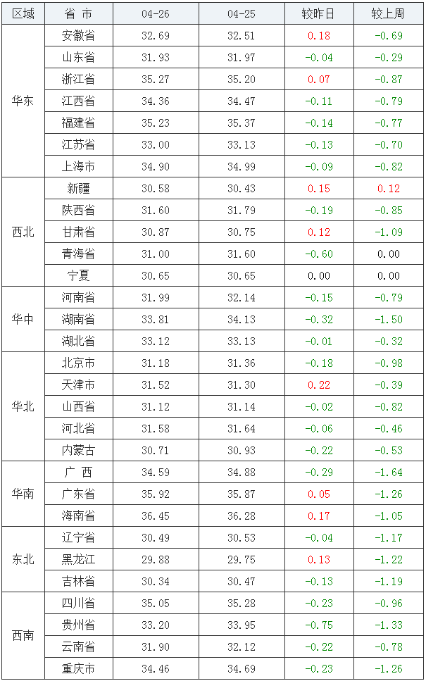 全国生猪均价(外三元)为32.75元/公斤,价格较昨日下跌0.17元/公斤;内三元生猪均价为32.04元/公斤,价格较昨日下跌0.01元/公斤;土杂猪生猪均价为31.54元/公斤,价格较昨日下跌0.13元/公斤;