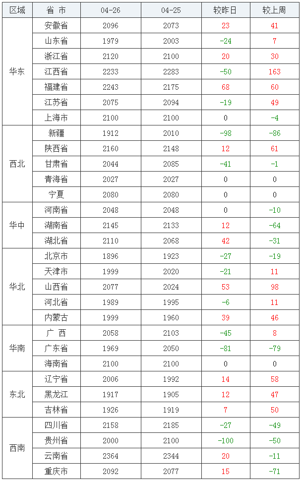 玉米均价(15%水分)后五:西藏自治区1850元/吨、北京市1896元/吨、新疆维吾尔自治区1912元/吨、黑龙江省1917元/吨、吉林省1926元/吨;
