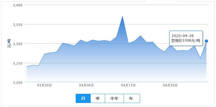 2020年04月26日,今日全国豆粕均价为3306元/吨,较昨日上涨44元/吨。