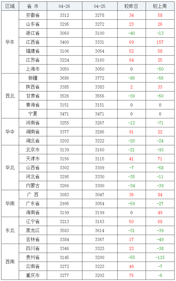 豆粕均价(43%蛋白)前五:新疆维吾尔自治区3686元/吨、黑龙江省3583元/吨、甘肃省3526元/吨、宁夏回族自治区3471元/吨、江西省3400元/吨;