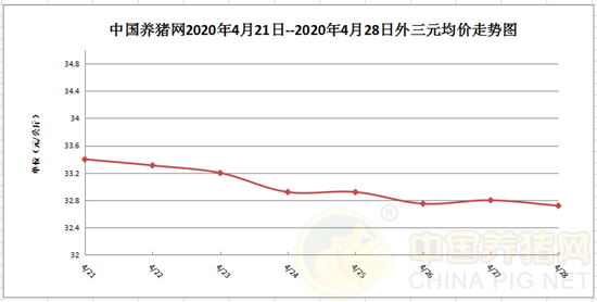 2020年4月28日(星期二),据中国养猪网猪价系统监测全国外三元均价为32.72元/公斤,价格较昨日下跌0.08元/公斤,较上周下跌0.68元/公斤。转眼“一瞬间”,生猪均价又脱离昨日的涨势掌控,被跌势拿捏的死死的。