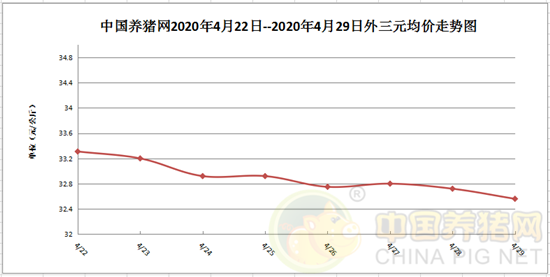 2020年4月29日(星期三),据中国养猪网猪价系统监测全国外三元均价为32.56元/公斤,价格较昨日下跌0.16元/公斤,较上周下跌0.75元/公斤。继昨日的多地下跌之后,今日跌势更是“猖狂”。