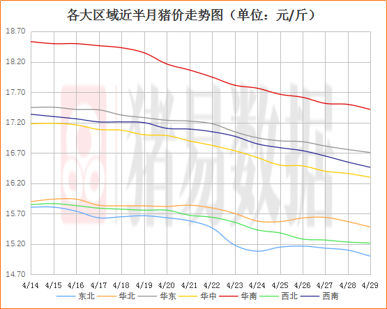 目前国内各大区域猪价差异化表现明显,华北、东北、西南、华东、华中、华南、西北地区猪价出现了一定幅度的下跌现象,整体猪价继续呈现下跌走势。