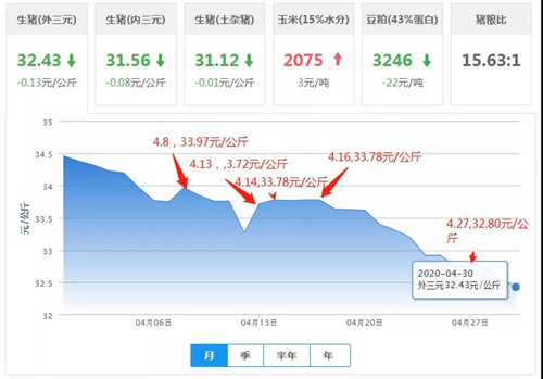 2020年4月30日(星期四),据中国养猪网猪价系统数据监测显示,今日我国外三元生猪价格为32.43元/公斤,较昨日下跌0.13元/公斤,较上周(4月23日)下跌0.77元/公斤,较上月(3月30日)下跌2.13元/公斤,环比下跌了6.57%;