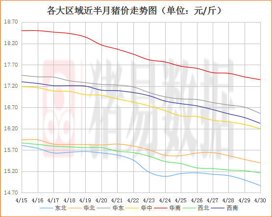 目前国内各大区域猪价差异化表现明显,华北、东北、西南、华东、华中、华南、西北地区猪价出现了一定幅度的下跌现象,整体猪价继续呈现下跌走势,均价跌破16元/斤。